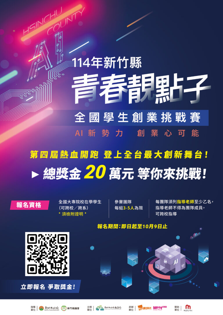 新竹縣政府-114年青年創新創業培育計畫-第四屆青春靚點子學生創業挑戰賽~10/09止
