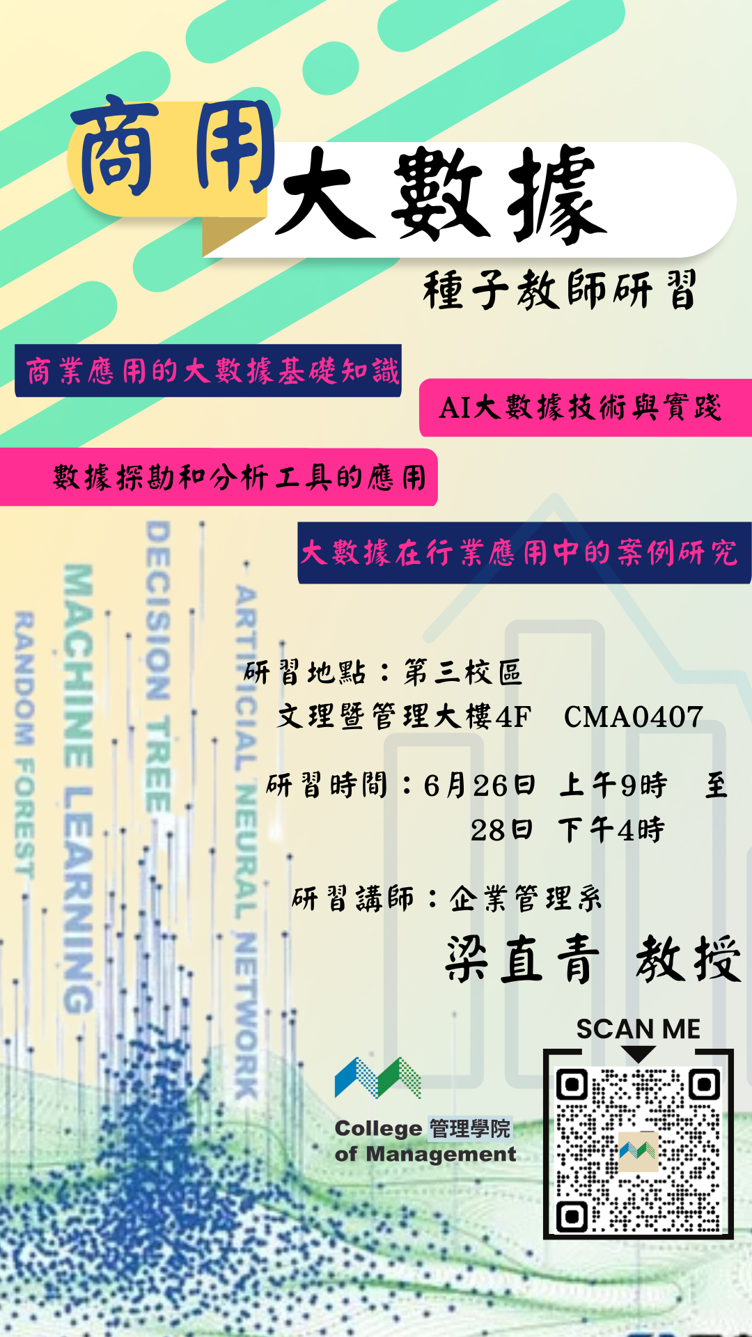 因應AI大數據之潮流,管理學院於6/26~28辦理”商用大數據種子教師研習”,以提升教師在數據領域的教學知能。我們誠摯邀請您參加此次研習,未來可在課程中融入大數據相關應用,研習後將由管理學院頒發研習證書。